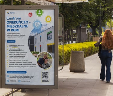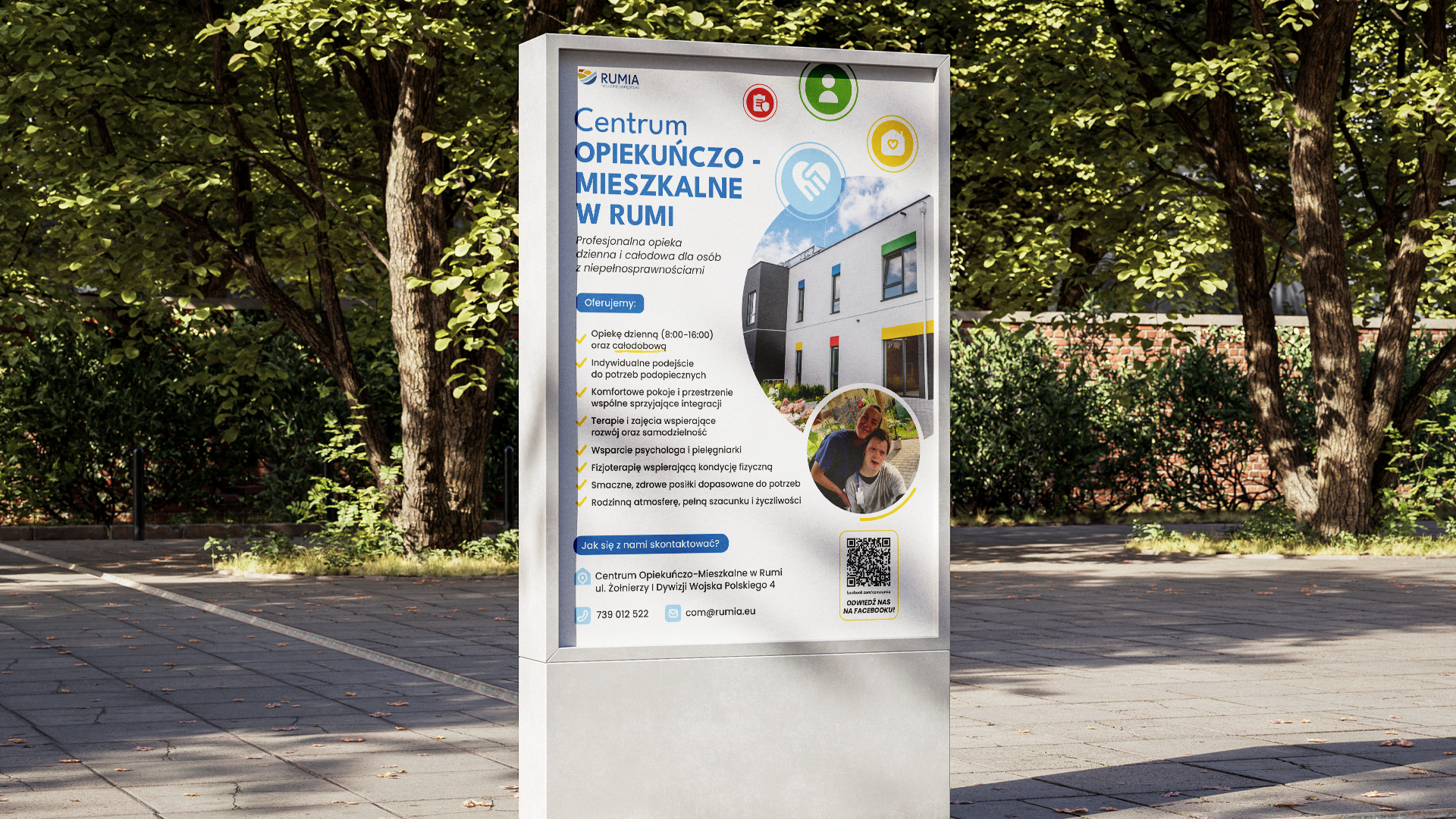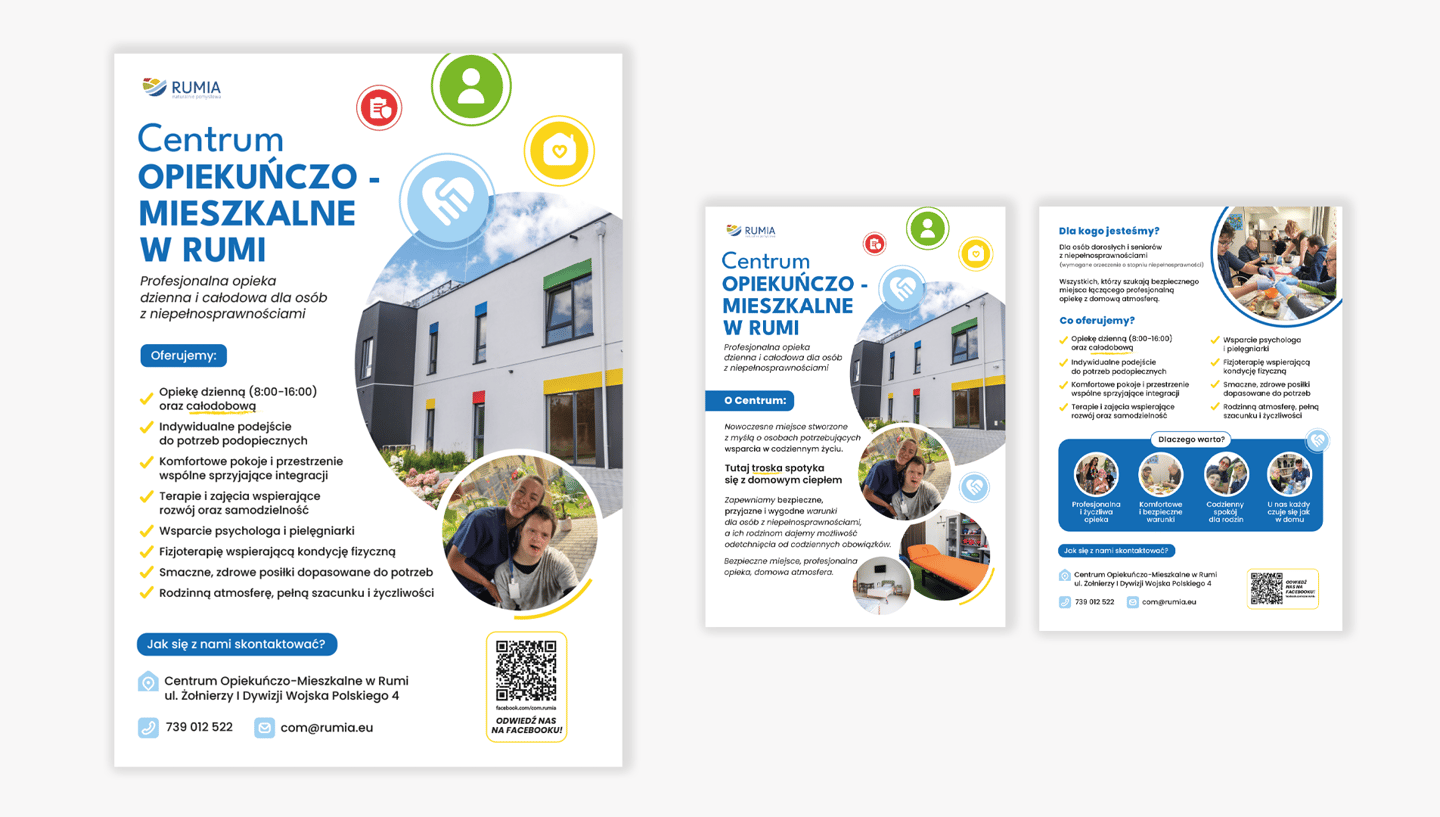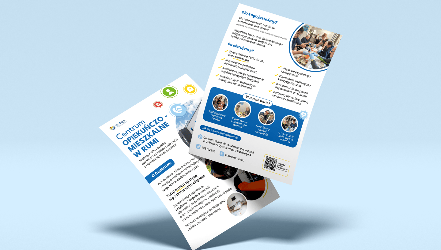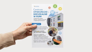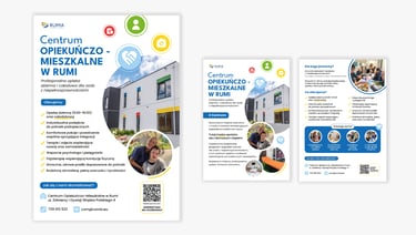 Opis:Zaprojektowałam dla Centrum Opiekuńczo Mieszkalnego w Rumi ulotek oraz plakatów promujących miejsca z opieką dzienna i całodobową dla osób
